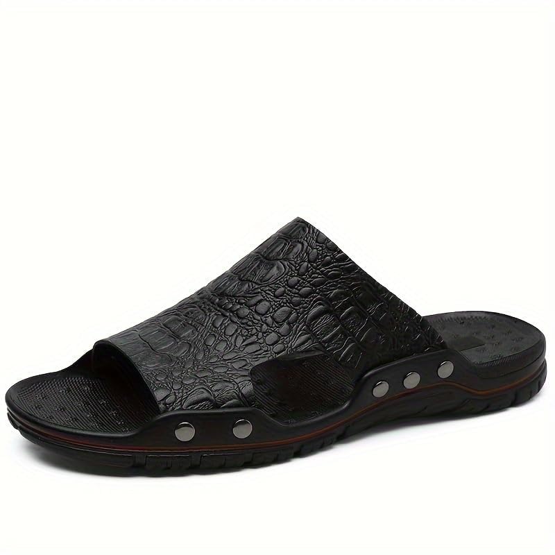 HOT ! Men's Genuine Leather Slippers - Crocodile Pattern, Non-Slip Soft Sole, Open Toe Beach Sandals for Summer, Summer Sandals | Open Toe Slippers | Textured Leather Strap