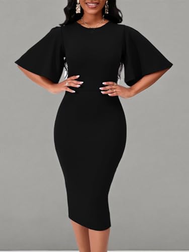 • Features: The bodycon work midi dress is simple and stylish. Ruffled flared sleeves, short sleeves, classic elegance. The round neck and zipper on the back make it easy to put on and take off. The length of the skirt just covers your knees and will not affect your various actions