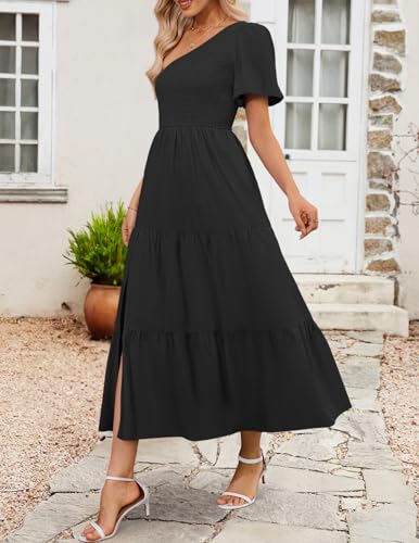ZESICA Women's Boho Summer One Shoulder Short Sleeve Smocked Side Split Ruffle Swing Midi Dress 1