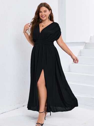 More information about Womens Summer Plus Size Maxi Dress 0XL-4XL V Neck Short Sleeve A-Line Slit Flowy Casual Guest Long Dresses