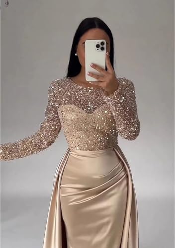 More information about Long Sleeve Sequin Satin Prom Dresses for Women 2025 Long Mermaid Round Neck Sexy Formal Evening Party Gown with Train