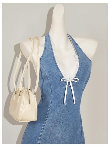 • Features: Y2k denim dress for women, contrast lace, bowknot appliques, halter neck, sleeveless, tie back, open back, mini length