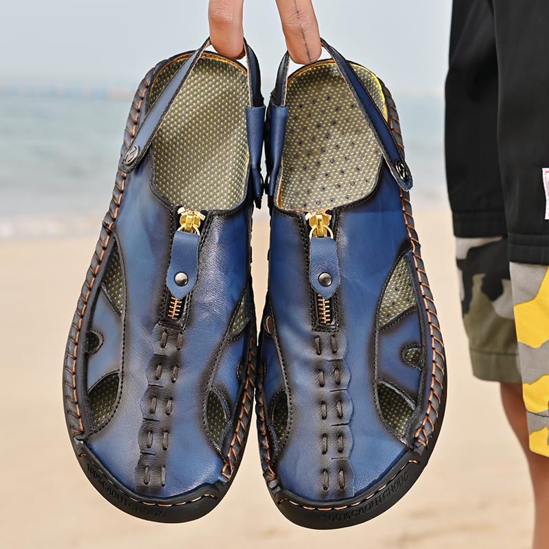 More information about Men's Leather Sandals, Handmade Stitched Design, Brown, Blue, Black Colors, Mesh Breathable Casual Summer Beach Shoes with Zipper
