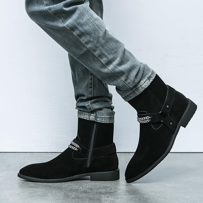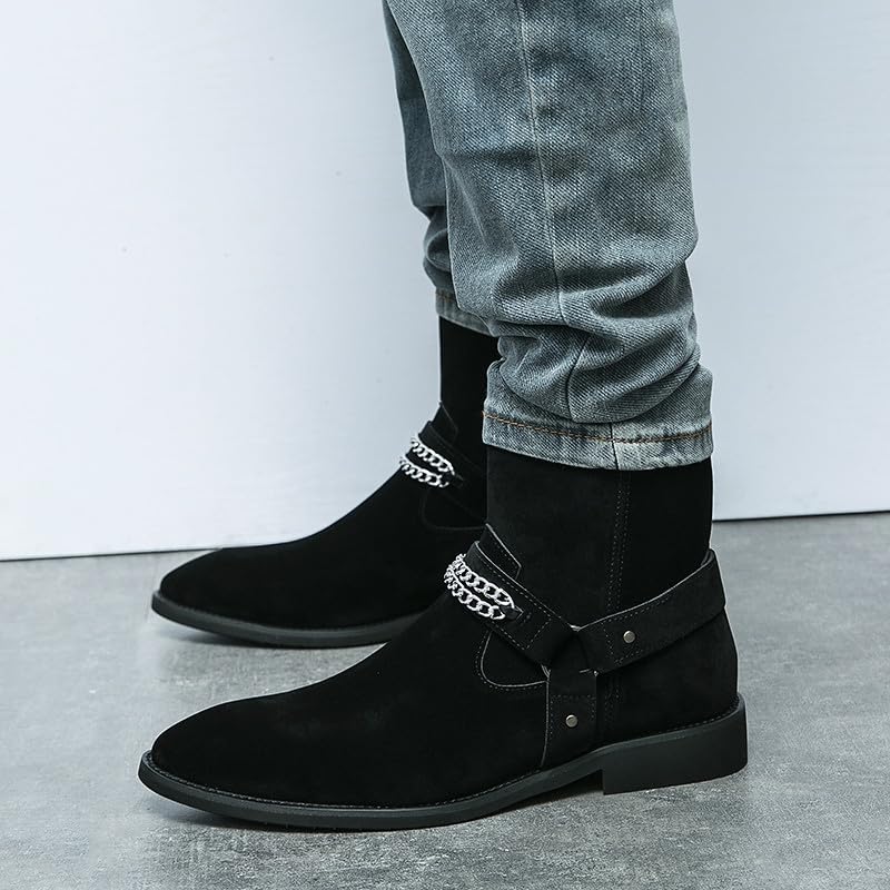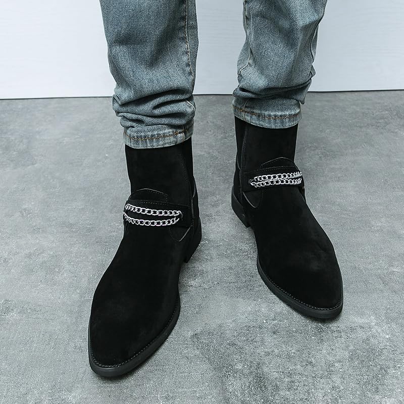 Santimon Men's Biker Punk Boots Belt Buckle Chain Strap Suede Dress Casual Boots with Side Zipper 1