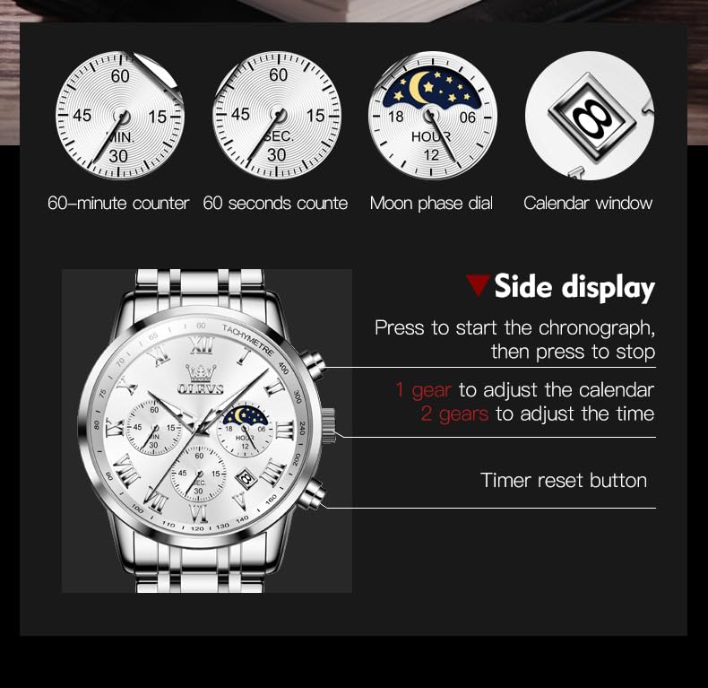 • Precision timing watch: The watch has three multifunctional sub dials - a moon phase dial, a second and minute chronograph, and a calendar. The addition of Roman numerals gives this watch a new depth and luster. The dial is exquisite, the case is well polished, and the hands are well made; Scratch resistant mineral glass dial is sturdy and durable, and the comfortable stainless steel strap is suitable for daily wear