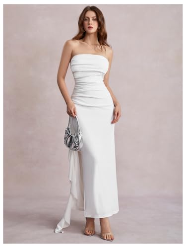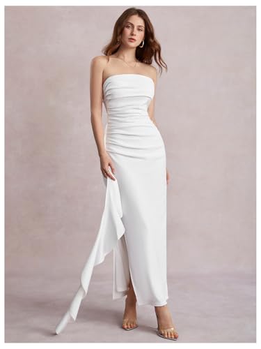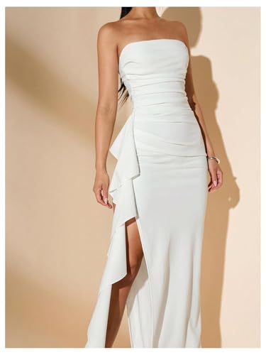 • Features: Strapless maxi dress for women, ruffle trim, high split, sleeveless, ruched