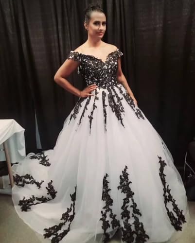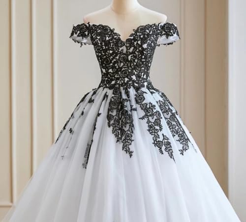 More information about Off Shoulder Boho Plus Size Wedding Dresses Lace Appliques White and Black Wedding Gowns Tulle Bridal Dresses