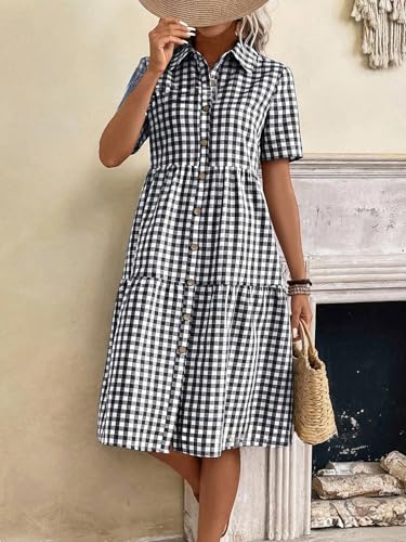 More information about chouyatou Women's Plaid Short Sleeve Button Down Shirt Dress Retro Gingham Button Up Tunic Midi Long Dress