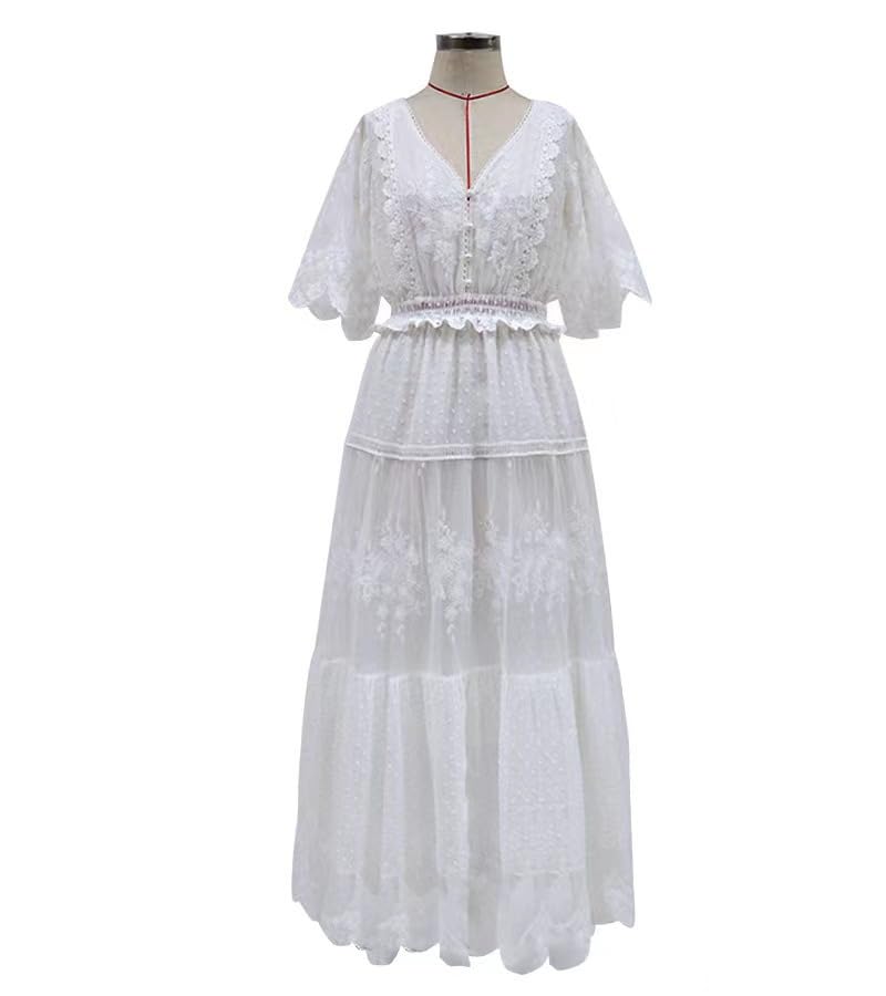 • 【STYLISH DESIGN】The 2025 trendy embroidery lace crochet maxi dress features button v neck, flutter short sleeve, stretchy high waist, slimming fit, classic solid color, ankle length, layered ruffled hemline, a-line silhouette make this long dress chic and flattering. This elegant eyelet lace dress is perfect for the woman who wants to keep charming and comfortable all the time!