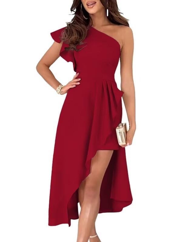 HOT ! A-line Ruffles Satin Wedding Guest Dress for Women, Midi One Shoulder Neck Formal Dress Cocktail Dress