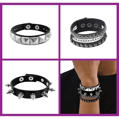 3 Pcs Punk Rock Studded Bracelet Set Spiked Leather Cuff Bracelet for Men Women 80s Wristband Emo Bracelet Adjustable 5