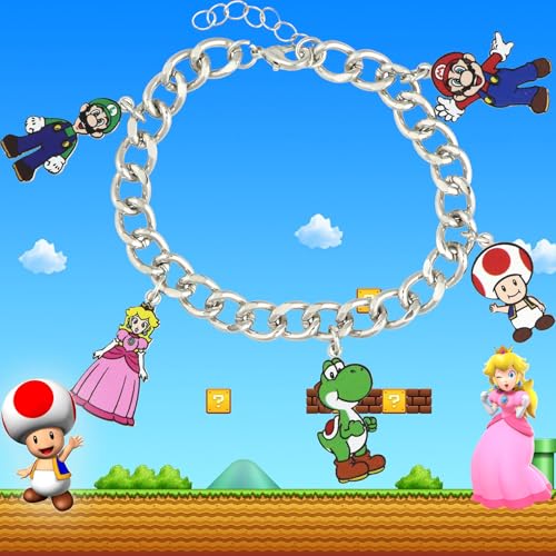 • (Cute Mario Baracelet): The Super Mario Bros Charm Bracelet for Women is a delightful and stylish accessory that brings video game characters to life. This fun, video game-themed bracelet features five distinctive character charms, each depicting some of the most popular Super Mario characters: Mario, Luigi, Princess Peach, Yoshi, and Toad.