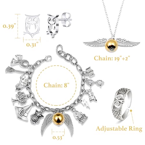 • ⛓Jewelry Set: Classic magic charm bracelet two, a length 8" adjustable, fits any size, and a pair of owl earrings. A Owl Rings with 2pcs Crystal eye, adjustable ring circle size. A magic necklace, length 19" + 2" adjustable