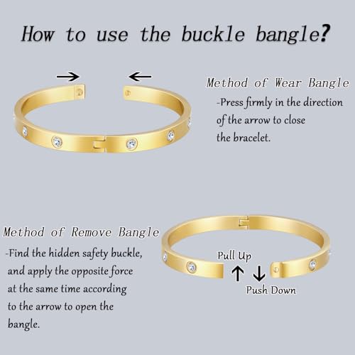• 【 Hidden Safety Buckle 】This stainless steel bracelet features a safety hinge clasp that seamlessly blends into the design, ensuring the beauty of the Cubic Zirconia bangle remains intact. To open or close, simply insert your index finger to pull the top part and use your thumb to push the bottom part, very easy to put on and take off.