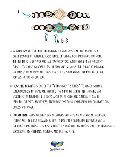 • Beachy howlite sea turtle and dalmatian cotton cord bracelet 2 pack. Measures 6.75 to 10.75-inch circumference. Easily layer with other bracelets! Cotton: water-resistant and stronger than hemp. This set of turtle bracelets is a perfect gift for couples. For you and your boyfriend or girlfriend or as a long-distance couples gift. These matching couple bracelets are made of strong cotton cord with turtle and dalmatian stones. Looks great stacked with other bracelets.