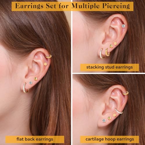 HOT ! Hypoallergenic Flat Back Earrings Set for Women Men Multiple Piercing Ears Small 14K Gold Cartilage Hoop Earrings 316L Surgical Stainless Steel Tiny Cubic Zirconia Stud Earrings Round Ball Stud Earring UNISEX