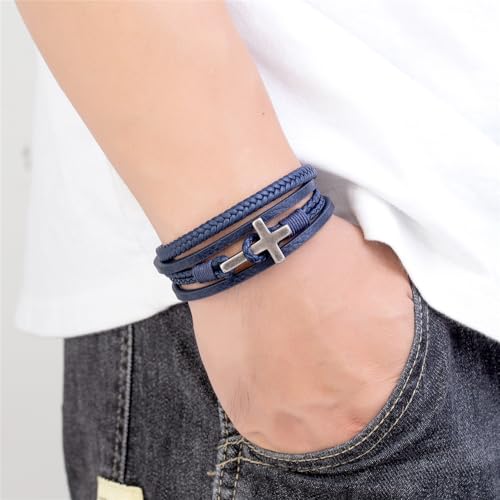 HOT ! Cross Bracelet for Men Black/Brown/Blue Braided Leather Religious Bracelet with Stainless Steel Silver Cross Charm Stylish Christian Jewelry 21 cm / 8.26 inches