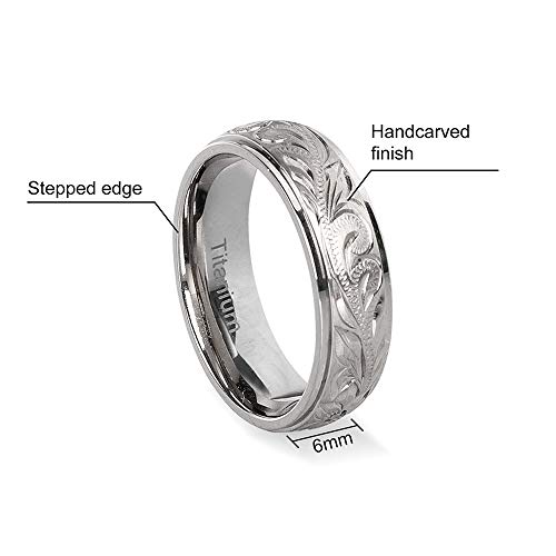 • HANDCRAFTED FLORAL DESIGN RING-The floral patterns on this titanium wedding band is handcarved. So each ring is unique