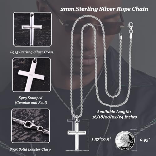 MILACOLATO Solid 925 Sterling Silver Cross Necklace for Men Women 1.5mm 2mm Durable Sterling Silver Chain with Cross Pendant for Men Silver Cross Crucifix Necklaces Jewelry 16-24 Inches (Wheat Chain/Rolo Chain/Rope Chain) 1