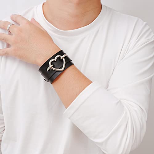 Manfnee 2Pack Punk Goth Bracelet for Man Women Leather Heart Metal Studded Cuff Wide Wristband Black 1
