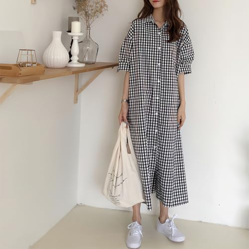 chouyatou Women's Summer Casual Short Sleeve Cotton Gingham Dress Plaid Midi Long Shirt Dress 1