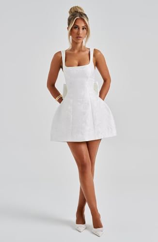• Feature: Be the belle of the ball in our Bow Mini Dress! The premium non-stretch floral jacquard fabric make it a standout choice. With a square neckline, adjustable straps, and waist cinching, it flatters your figure. Plus, the detachable oversized bow adds an extra touch of whimsy. Tulip skirt, and lace-up back complete the look.