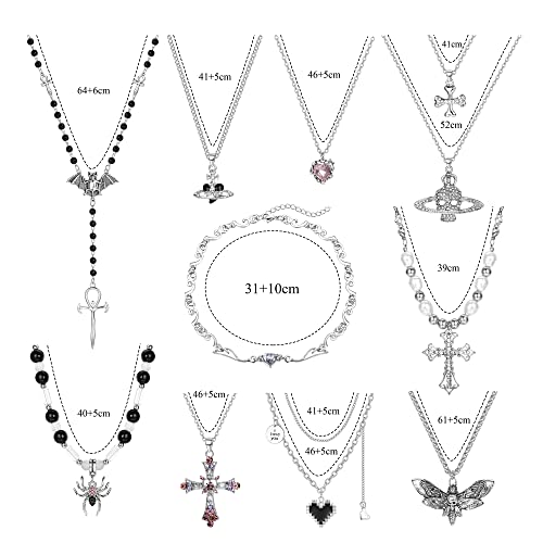 • 1️⃣1️⃣​Pcs Y2k Necklaces For Women: Heart saturn y2k necklace, star heart gothic necklace, heart layered emo necklace, pearl cross choker, angel heart wing choker, gothic spider necklace, skull necklace y2k, cross skull saturn layered punk necklace, pink crystal cross pendant grunge necklace, ankh cross bat necklace, enough options for you to choose and match your different outfits.
