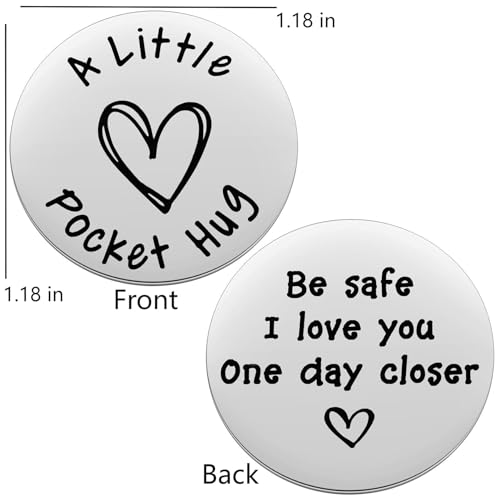 • *Double-Sided Pocket Hug Token* The front reads "A little pocket hug", and the back reads "Be safe I love you One day closer". This token is a little adorable gift for men, boys to carry with them always, either in their pocket or purse.