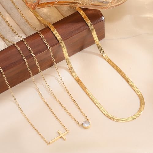 • Cross Necklace for Women: This gold necklace for women includes an elegant cross necklace, a trendy herringbone chain, and a dazzling cubic zirconia necklace. All three gold plated necklaces can be worn individually or layered together