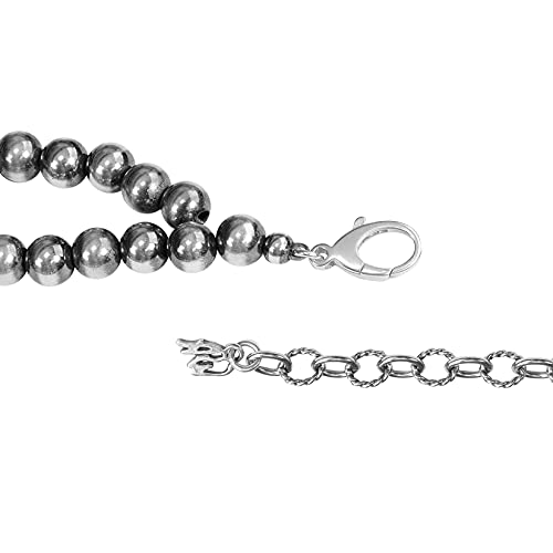 • Beautiful Western Jewelry - Naturally colorful Southwestern sterling silver squash blossom necklace designed by Carolyn Pollack features a double strand of 8mm oxidized polished silver beads with 9 White Howlite gemstones. There are 6 squash blossom stations with a 15x20mm arrowhead-shaped Howlite. The center Naja holds 3 soft arrowhead-shaped stones, two 15x20mm and one 26x28mm Howlite. All stones are set in scalloped bezel mountings on a floral and beaded design.
