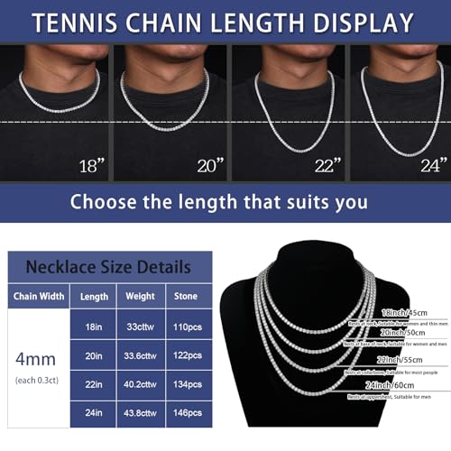 • 【Classic Tennis Necklace Size Guide】The necklace width of the chain is 4mm, which means the size of a single diamond is 4mm=0.3 carats. The length is size 18-24 inches. Everyone's neck size is different, please measure your neck circumference and find the ideal place you want your necklace to reach before you buy. Moissanite necklace fits Men and Women. And TUHE Jewelry provides excellent after-sales service.