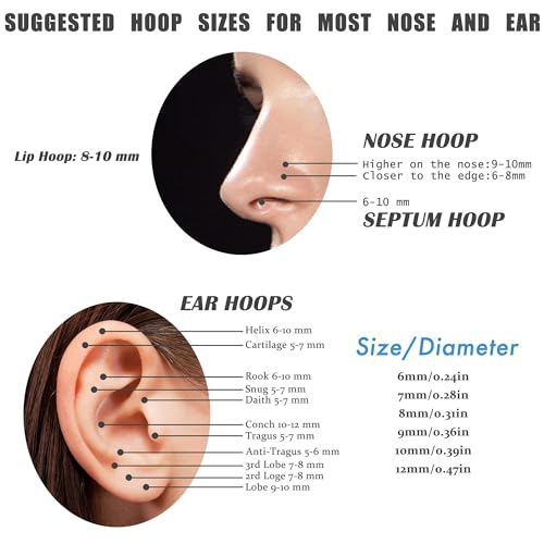 • Notice Before Buying Our Nose Ring: Please carefully select the most suitable gauge and diameter size according to the suggested size for mostly and size chart reference before ordering the titanium nose ring. This nose ring hoop can be used for side nose/septum/lip/helix/rook/conch/lobe/snug/tragus/daith and etc