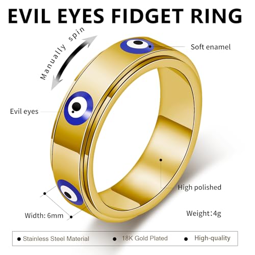 Evil Eye Fidget Ring for Women - 18K Gold Plated Stainless Steel Spinner Rings for Anxiety Relief, Ojo Turco Ring Luck Amulet, Turkish Faith Protection Stackable Jewelry Gift for Women Men 1