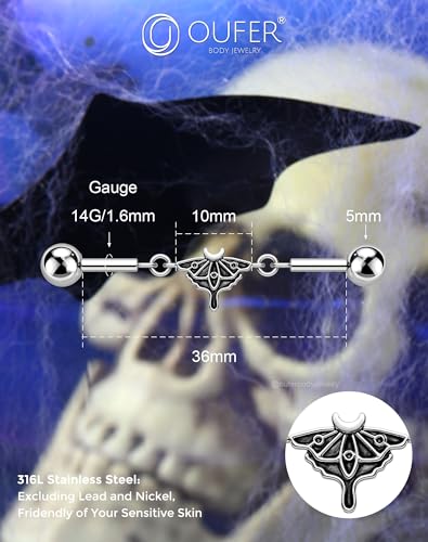 HOT ! OUFER Moth Industrial Piercing jewelry, Chain Industrial Bar, 316L Surgical Steel 14G Industrial Earrings for Women Men, Hallween Industrial Jewelry