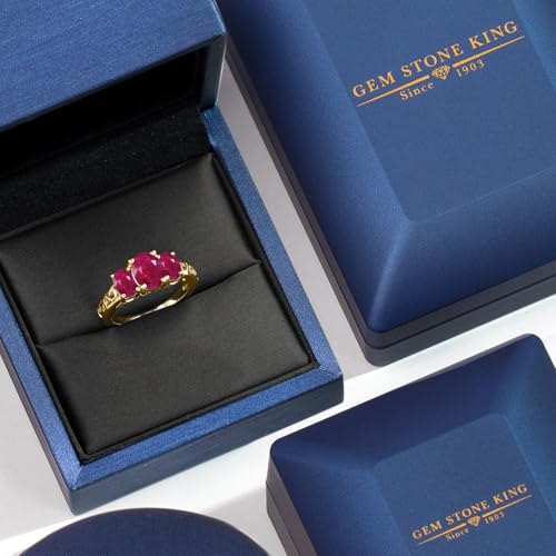 HOT ! Gem Stone King 18K Yellow Gold Plated Silver Red Ruby Filigree Style 3 Stone Ring for Women (2.80 Cttw, Oval 8X6MM and 6X4MM, Available in Size 5, 6, 7, 8, 9)