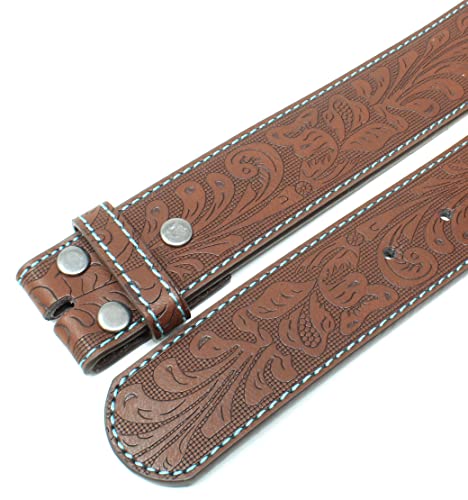 BC Belts Leather Belt Strap with Teal Stitching and Embossed Western Scrollwork 1.5" Wide with Snaps 1