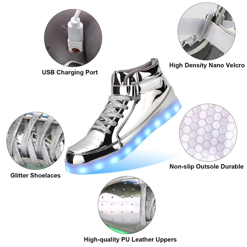 • 【Shining In The Night】: Padgene kids LED Shoes adopts new gliter material, which is more shining,and the inner material can keep your feet drt abd comfortable for long walks,while the flexible grooves bottom pattern strengthen the shoes ability of anti-skid and grip