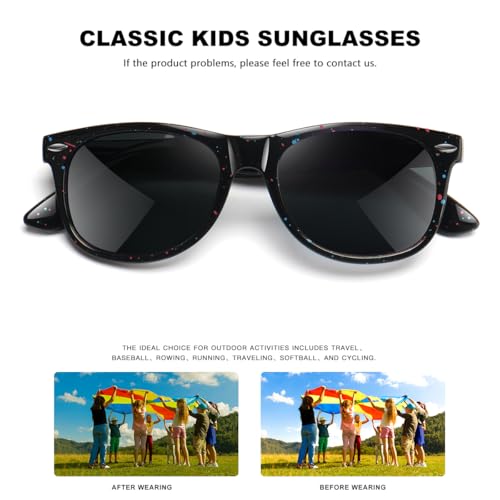 • Perfect Eye Protection: Our kids sunglasses feature premium polarized lenses, delivering dual protection for eyes. They effectively filter harsh glare for sharper, more comfortable vision, while blocking 99% of harmful UV rays to form a robust defense for delicate eyes