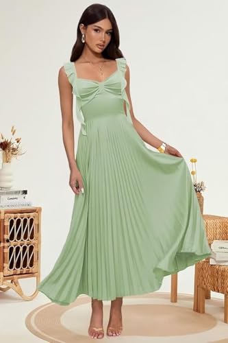 • Material:Pleated tea length bridesmaid dress in soft and comfortable fabric, flowy ruffles on spaghetti straps,a-line,v neck,lace up back,floor length,maxi formal gowns for women.