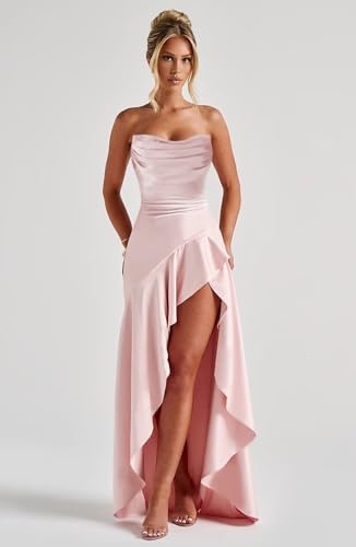 • Features: Elegant Satin Hi-Lo prom dresses with slit, Strapless prom dresses for women plus size formal evening party gowns. Dressing the Satin prom dress, making you more elegant, simple, modest, charming, and confident at any special moment.