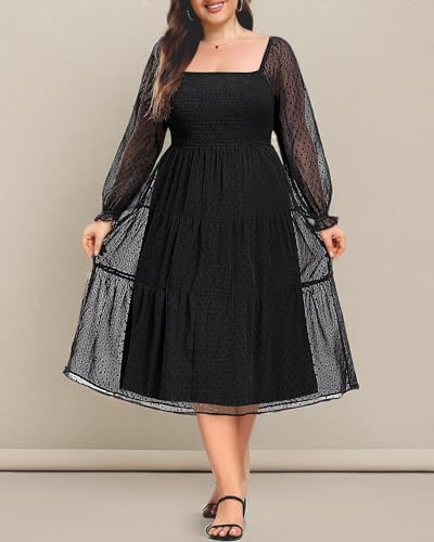 Women's Plus Size Long Sleeve Dress Wedding Guest Square Neck Summer Midi Swiss Dot Flowy Smocked Dress 6