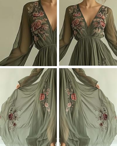 • 【Features】: Deep V-neckline, long sheer sleeves, and a flowy skirt with floral embroidery. The V-neckline elegantly frames the neck, while the sheer sleeves add a touch of sophistication. The flowy skirt with floral embroidery creates a chic and feminine look