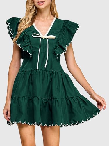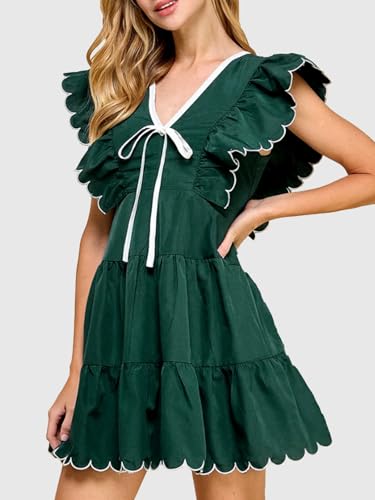 HOT ! Ruffle Sleeve Tiered Babydoll Mini Dress for Women with Bow Tie Front, Scalloped Edge Contrast Trim Flowy Dress