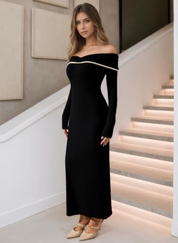 HUUSA Off The Shoulder Dress for Women 2025 Long Sleeve Bodycon Sexy Party Maxi Color Block Dresses 4