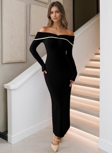 More information about HUUSA Off The Shoulder Dress for Women 2025 Long Sleeve Bodycon Sexy Party Maxi Color Block Dresses