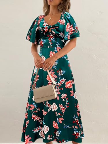 More information about Fashionme Womens Dresses 2025 Maxi Dresses Deep V Neck Elegant Bow Tie Front Cap Sleeve Summer Floral Satin Smocked Dress