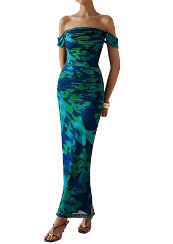 More information about PRETTYGARDEN Maxi Dresses for Women 2025 Summer Elegant Floral Off Shoulder Ruched Mesh Cocktail Wedding Guest Dress