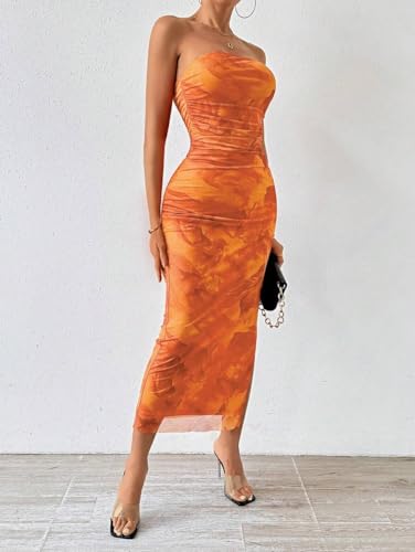 • Style: Fancy strapless tube top dress, bodycon ruched, tie dye print, mesh overlayed, maxi long length, side slit, stretchy and durable, comfortable to wear.