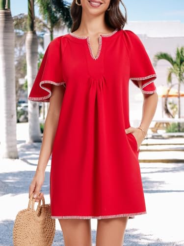 HOULENGS Women's Summer Flutter Short Sleeve A Line Mini Dress Casual Contrast Trim V Neck Short Dress with Pockets 1