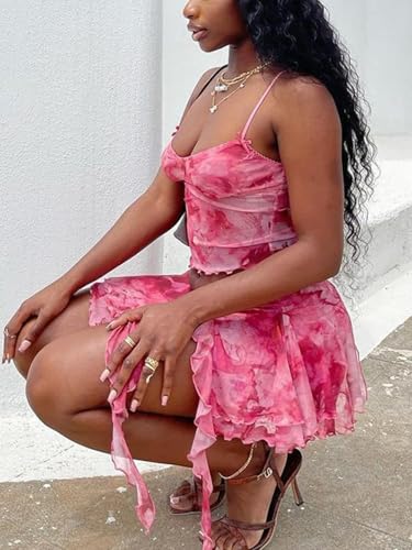 • Sexy 2 Piece club outfits for women, spaghetti straps, floral print, ruffle trim, mini skirt with high slit, camisole crop top, stretch mesh material, y2k summer beach outfits for women, 2 piece skirt sets for women